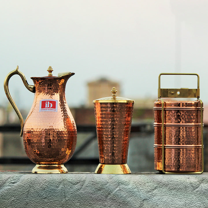 According to Ayurveda water stored in a copper jug has the ability to balance all the three doshas in our body (vata kapha and pitta) and it does so by positively charging the water. Storing water in a copper vessels works as a purification process. It also helps maintain bodys pH (acid-alkaline) balance. There are also numerous health benefits that have been attributed to drinking water in copper glasses. Over the centuries copper has been used in various forms to treat various illnesses including cuts headaches etc. The rise of ayurvedic usage and indigenous medicines has seen a rise in the use of copper products in household items especially copper jugs glasses and cups