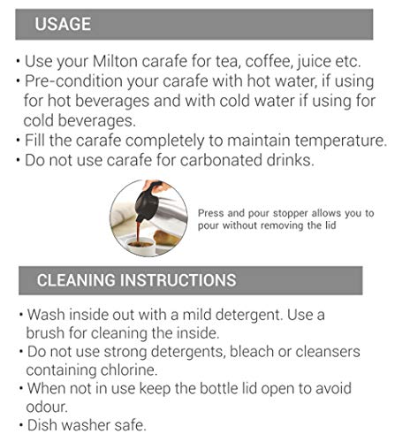 • Colour: Silver Material: Stainless Silver. Package Contents: 1 - Piece Milton Thermosteel Carafe (1000 ml)