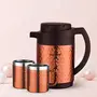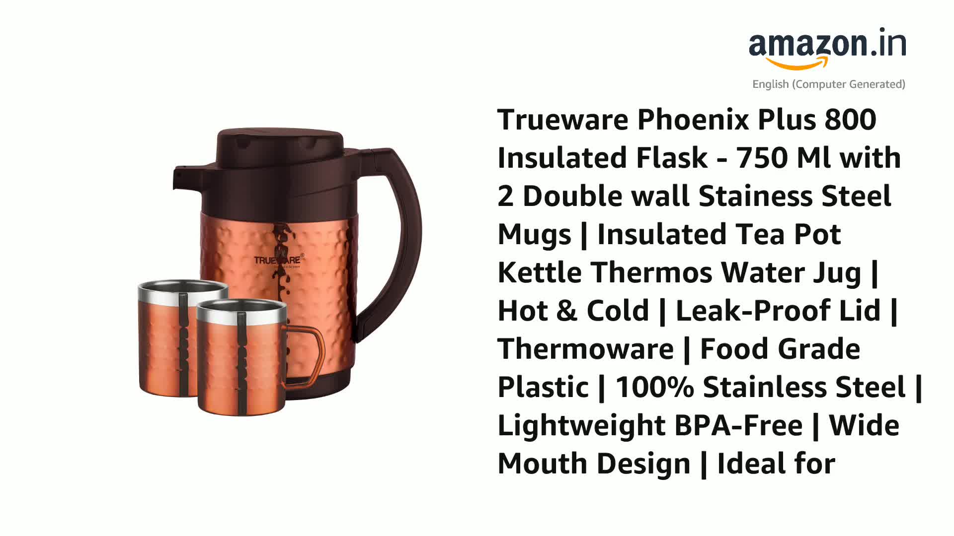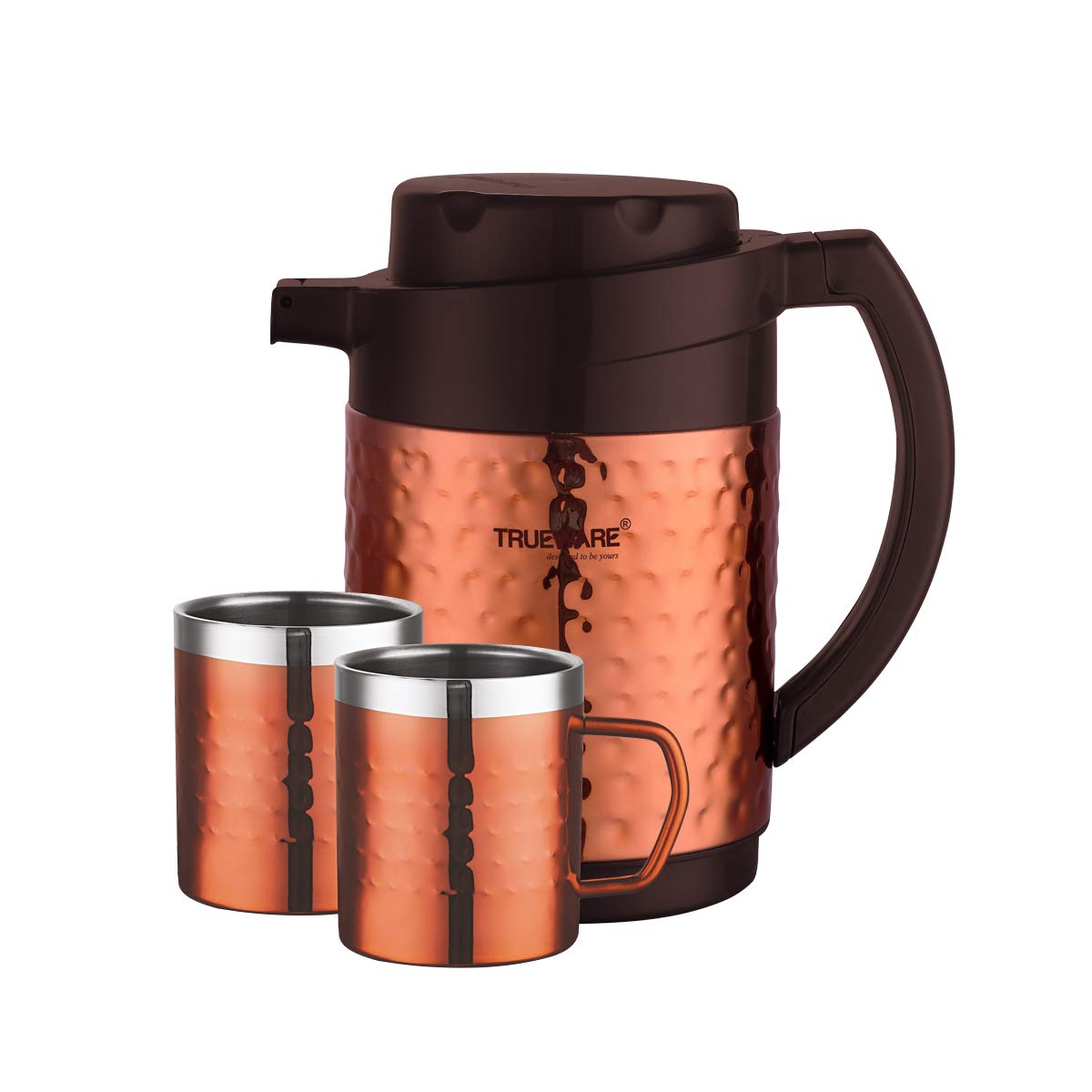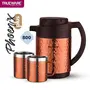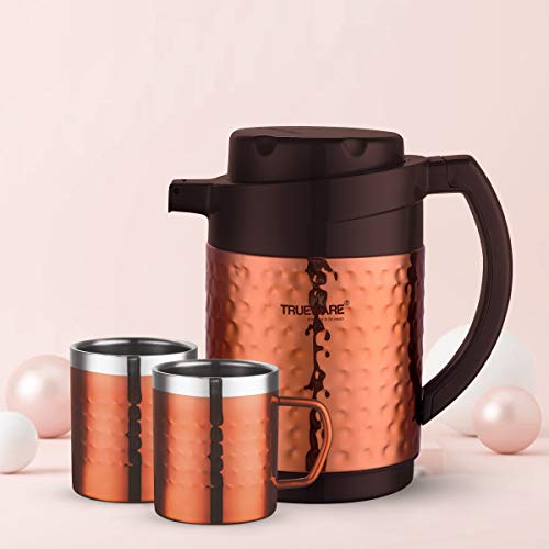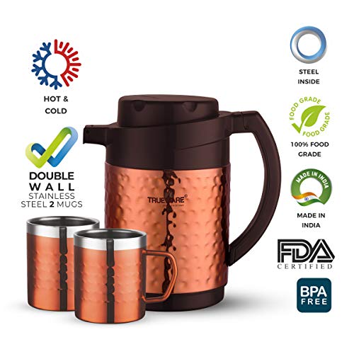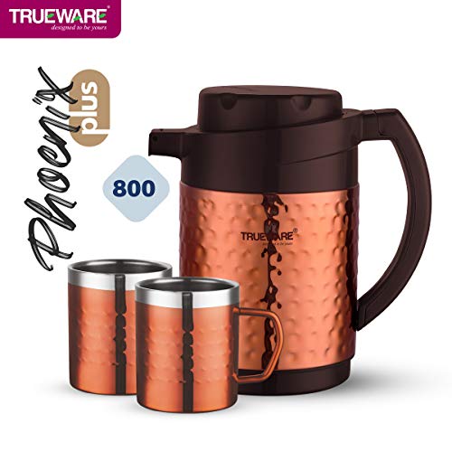 Trueware Phoenix Plus Insulated flask is designed to keep your beverages hot/cold for long hours. The Stainless steel body inner side and high grade hammered steel body with copper lacquer coating outside makes it an elegant looking flask. This flask keeps the non –carbonated beverages /liquids hot or cold for 6 to 10 hours depending on the usage. Trueware Phoenix Plus Flask comes with 2 Double Wall Insulated Mugs. All over sealed body no point of any leakage or dripping while travelling or so… Smooth finished handle to grip it and pour your favourite beverages / liquids. It has inner –steel body which makes it Unbreakable.