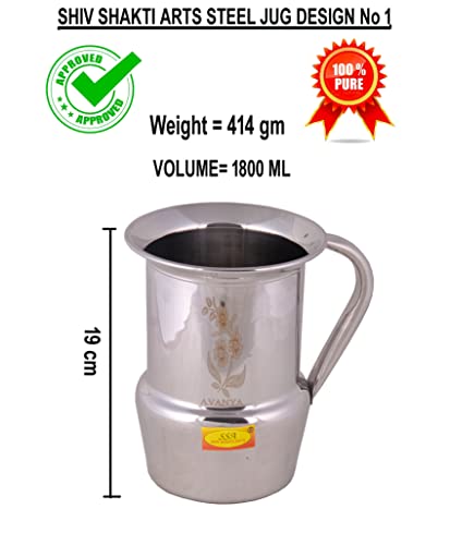 • 4 Piece Steel Jug Dimensions : (Height X Width) 19 cm x 14 cm; Weight = 414 Grams each appx Volume-1800 ml each