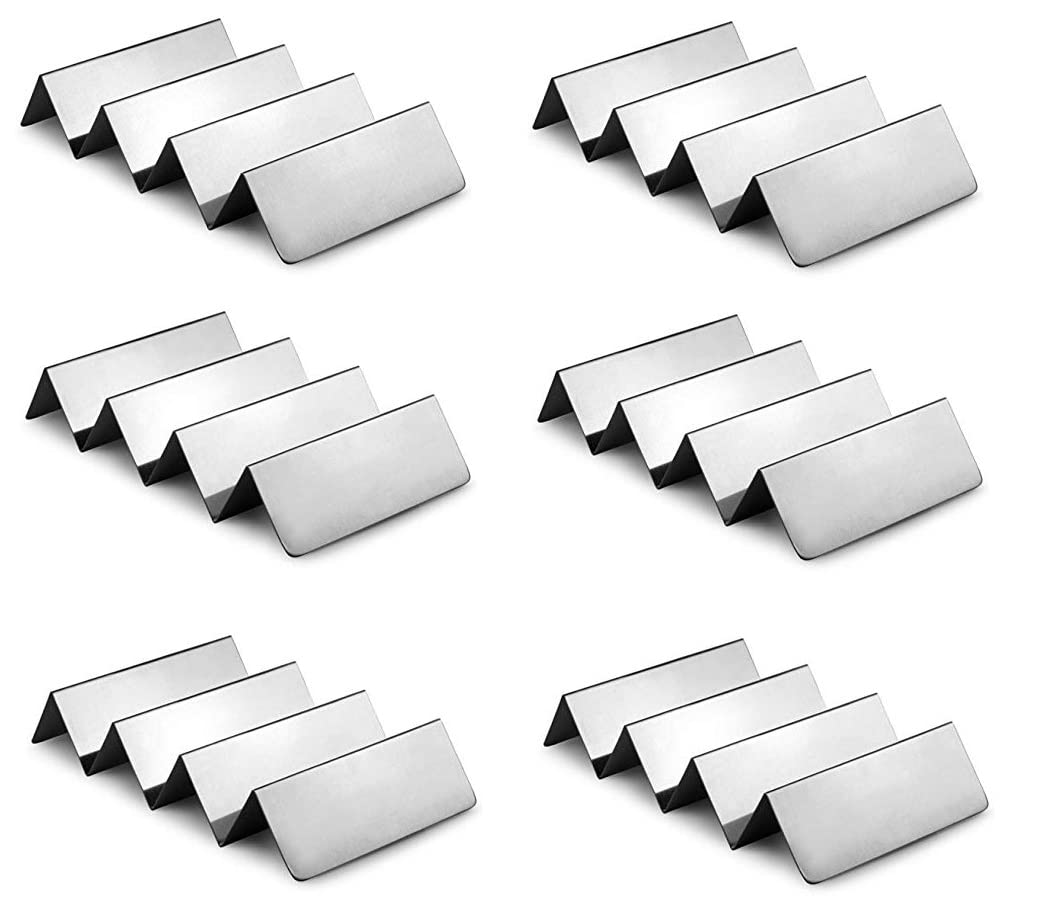 Fill, serve, and enjoy your next taco night with taco holder. Made of 100% stainless steel, This taco holder holds 4 taco, but flip it over and it will hold 3 tacos. It's made of stainless steel, Works great for fast and easy preparation, serving, AND EATING of perfect, unbroken, undumped tacos, everytime! this taco holder is dishwasher safe for easy cleaning. Set of 6 Taco Holder