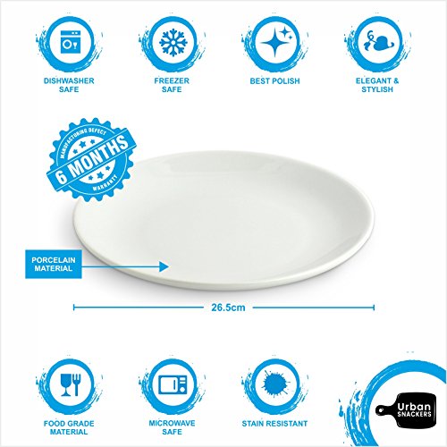 URBAN SNACKERS Size:26 cm porcelain plates is healthy for everyday use porcelain plates is fired under 1300 degree bpa free lead and cadmium free durable and sturdy safely used in dishwasher microwave freezer and oven. Perfect for modern living in your home kitchen during dining and entertaining elegant white glaze bringing visual pleasure to the table match all kinds of table linens and your current white or colorful dinnerware making it ideal for any creative food presentation whatever the cuisine. Classic round shaped with wide rim style can easily stack together save space. Warm gift for mom friends or the one you loved on special day or festivals. Gift box available for a warm surprise to mom friends and the one you loved when birthday wedding party or christmas other festival.