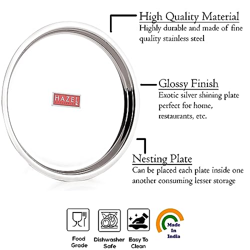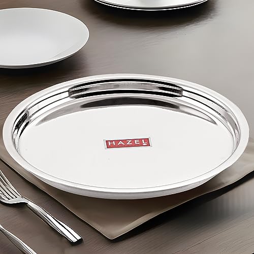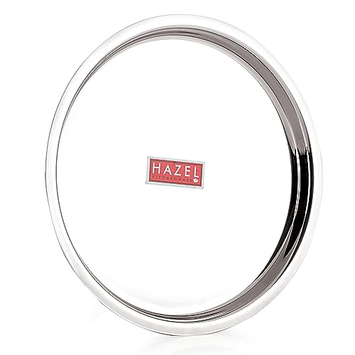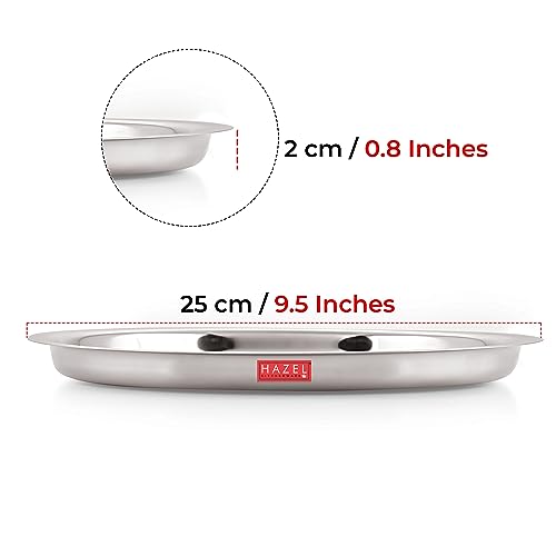 HAZEL Stainless Steel Plates Set | Premium Mirror Finish Thali Set Stainless Steel | Heavy Gauge Steel Plates Set For Dinner & Lunch Set of 1 25 cm It is very economical in range made of food grade stainless steel. It is non breakable durable sturdy rust free and long lasting. Stainless steel is hygienic to use and easy to clean as compared to other materials. This set can be nested one into another and therefore helping save shelf space in the kitchen. This set is perfect for gifting purposes at weddings anniversaries. You get a magnificent dinner plate set at an extremely affordable price. Food served on this elegant dinner plate set improves the dinner table setting. This set is made from high quality stainless steel making it exclusive and durable. This set has been beautifully designed to add grace to your dining experience. Easy to clean and wash they have very exotic silver shining.An ideal plates to serve various food products on dinning table. Available in multiple sizes according to need of kitchen. Large Thali / Plate Dimension : Diameter: 25cm / 9.5 Inches Height: 2 cm1 Year Manufacturer Warranty. This product is under 1 Year Warranty from the date of retail purchase against any manufacturing defects in material and workmanship. The Warranty does not cover damages resulting from accidents mishandling or tampering with the mechanism. Warranty valid against producing original bill endorsed by the seller.