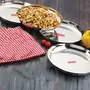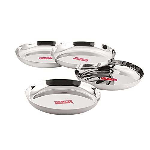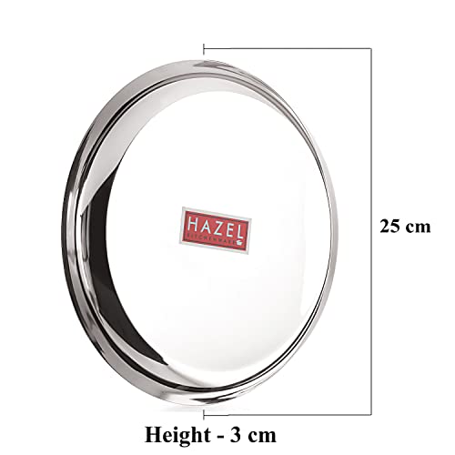 HAZEL Steel Plates For Lunch |Plates Set Steel For Dinner | Steel Plates Set 25 cm Set of 4 Featuring a set of 6 piece stainless steel dinner plate set. It is very economical in range made of food grade stainless steel. It is non breakable durable sturdy rust free and long lasting. Stainless steel is hygienic to use and easy to clean as compared to other materials. This set can be nested one into another and therefore helping save shelf space in the kitchen. This set is perfect for gifting purposes at weddings anniversaries. You get a magnificent dinner plate set at an extremely affordable price. Food served on this elegant dinner plate set improves the dinner table setting. This set is made from high quality stainless steel making it exclusive and durable. This set has been beautifully designed to add grace to your dining experience. Easy to clean and wash they have very exotic silver shining.An ideal plates to serve various food products on dinning table. Available in multiple sizes according to need of kitchen. Medium Thali / Plate Dimension : 25 x 25 x 3 cm (LxBxH)1 Year Manufacturer Warranty. This product is under 1 Year Warranty from the date of retail purchase against any manufacturing defects in material and workmanship. The Warranty does not cover damages resulting from accidents mishandling or tampering with the mechanism. Warranty valid against producing original bill endorsed by the seller.