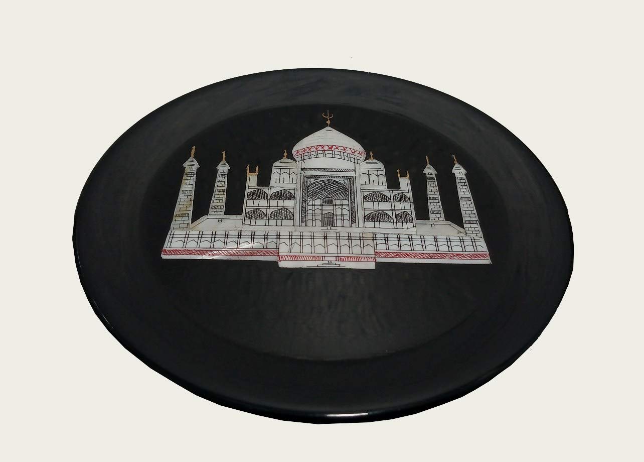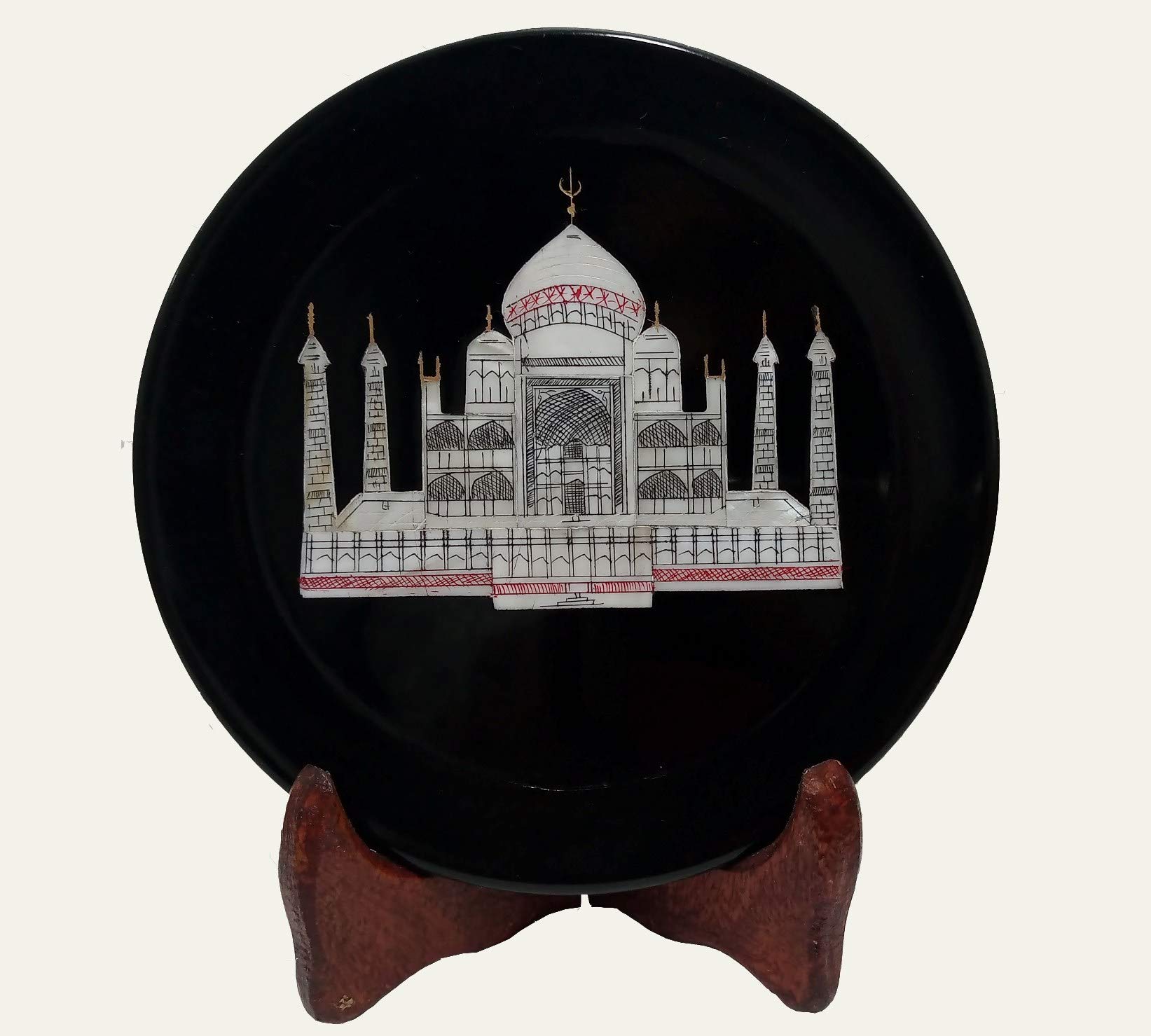 MARBLE INLAY ART AGRA - PACCHIKARI Handcrafted Black Marble inlaid Taj Mahal Plate For Office and Home. Design: Taj Mahal Inlay With Mother of Pearl. We will send you small wooden stand also to display. We are himself manufacture of this product so we do custom design also. To maintain this art piece simply clean it with cotton cloth and apply white wax for shine. It is an art piece which will be a beauty & the conversation piece at home.