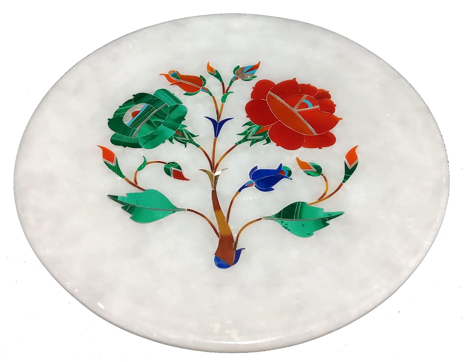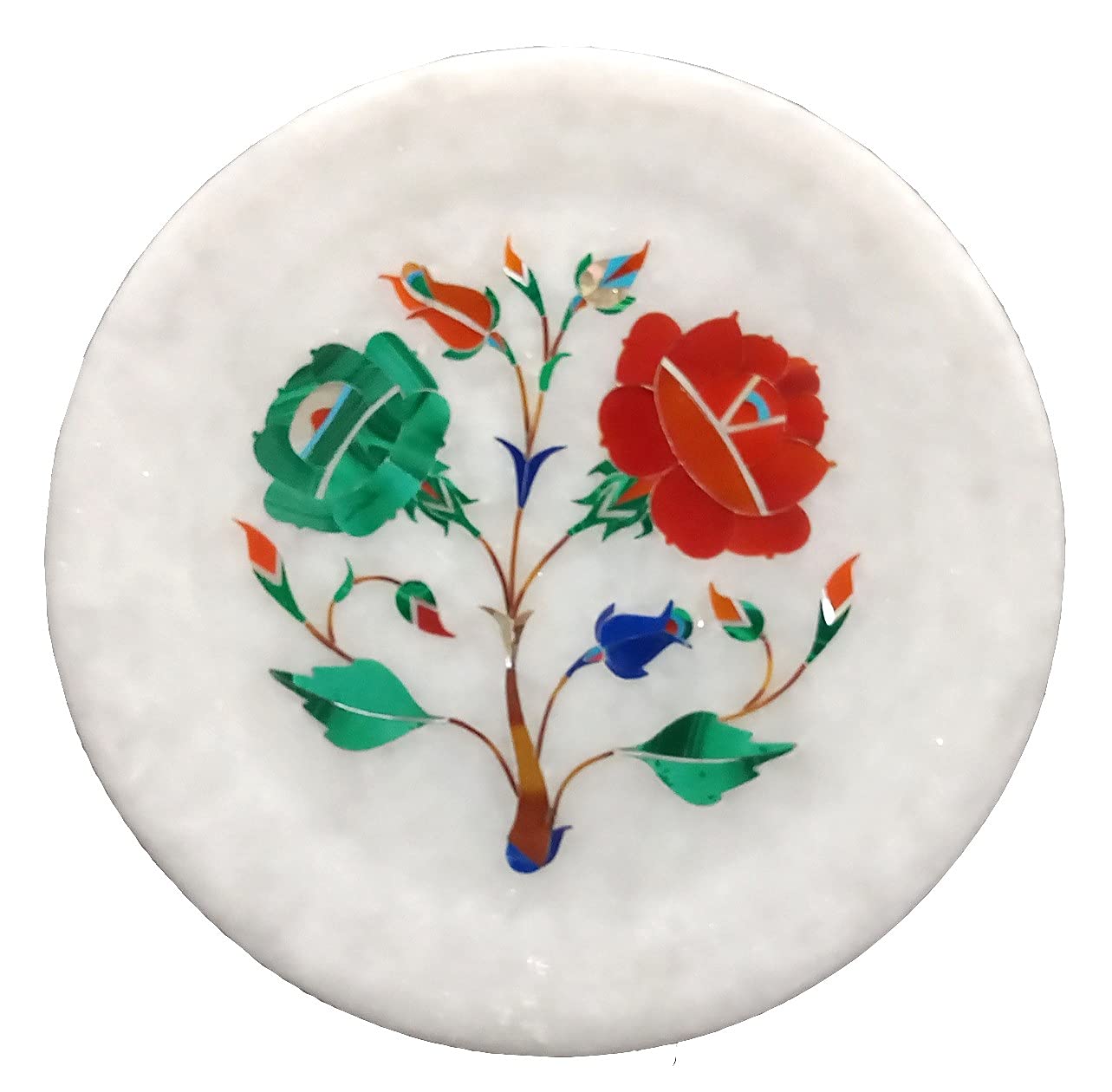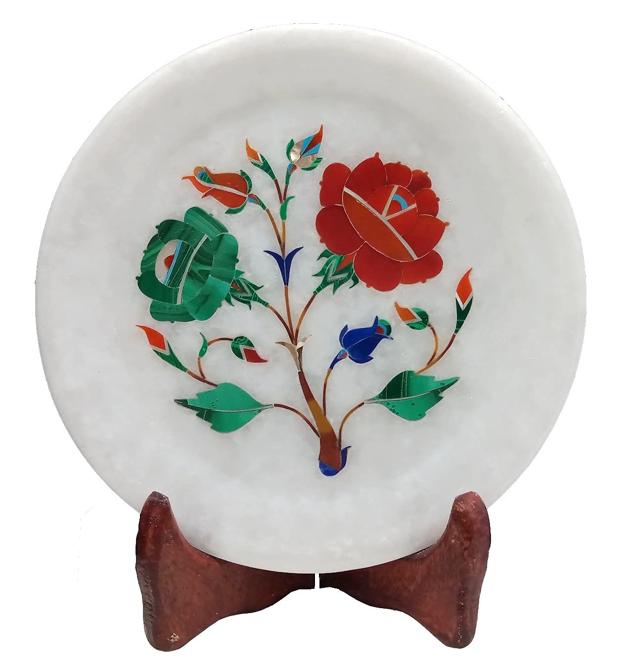 The White Marble Inlaid Plate is made in Agra India & fully handmade with inlay stone not a color or paint. MARBLE INLAY ART AGRA - PACCHIKARI Handcrafted White Marble Plate Perfect for Office Home and Hotel Decoration. Design: Floral with tree of life.. We will send you a paper with description and Meaning of the stone . We will send you wooden stand also to display. We are himself manufacture of this product so we do custom design also according to your color size and shape and bulk order too. To maintain this art piece simply clean it with soap water and dry cotton cloth. It is an art piece which will be a beauty & the conversation piece at home and perfect example of make in India. Stone are inlaid in the Plate Are Malachite - Green. Carnelian - Orange. Jasper - Brown. Turquoise - Light Blue. Mother Of Pearl - White. Lapis Lazuli - Dark Blue.