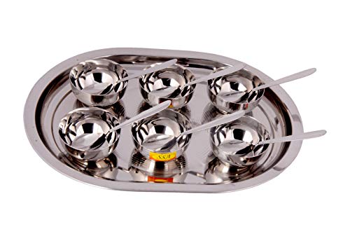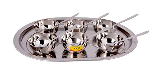 • Stainless Steel (Heavy Gauge) Serving Dinner Plate/Tray Set 13 Pieces - (Silver Touch Design Length - 40.3 cm)Oval Shape = 1 Tray 6 Bowl 6 Spoon