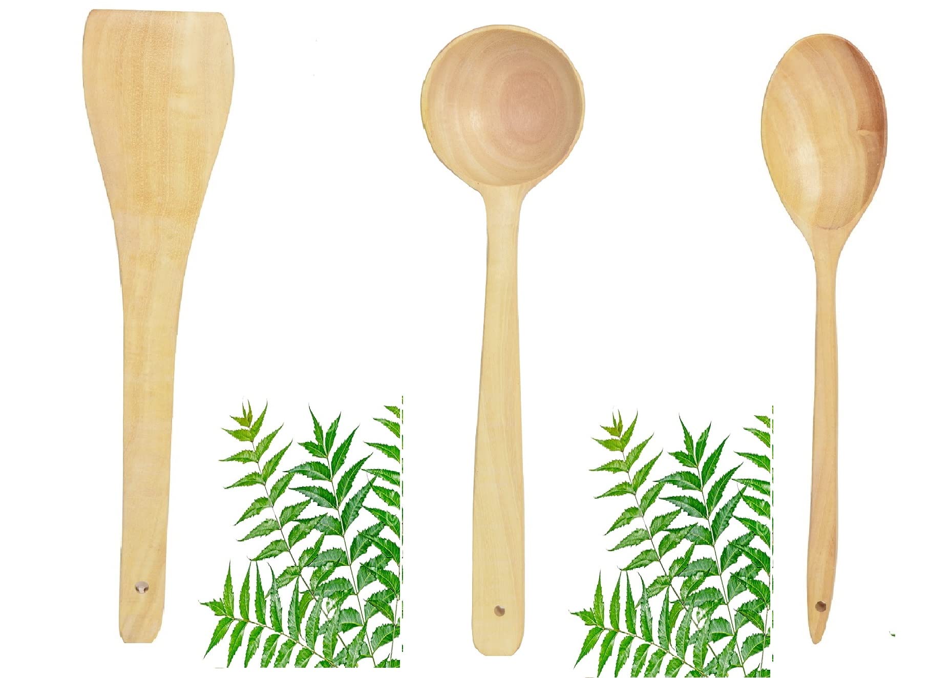 This Wooden Spoons for Container is Made of solid Neem wood which good for health and Neem wood is Anti Bacterial. Wooden spoon combo with disposable small spoon Set of 3 Kitchen tools is Safe for non-stick cookware. Get this wooden spoon eating or cooking The dimension of Spatula/Ladles are 10 to 12 inches which is Large comfortable handle. These are the healthy wooden spoon for containers or other purpose Best Utensil set with natural finish and Non-Toxic Eco-Friendly. These spoons are totally made in India and can be used for wooden spoon jar These kitchen wooden spoons are harmless to use in any utensil or cookware. The non-scratch wooden spatula is not going to leave any scratch on your pans