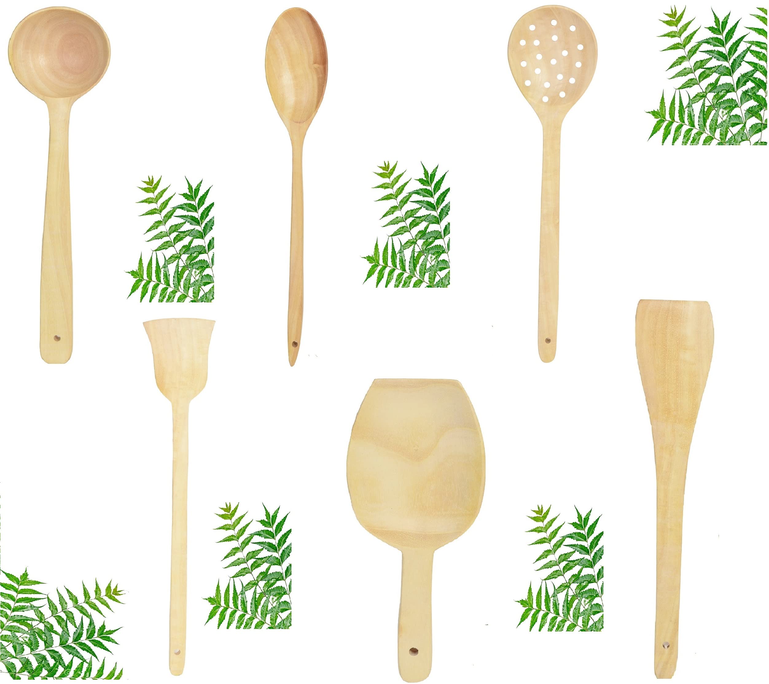 This Wooden Spoons for Container is Made of solid Neem wood which good for health and Neem wood is Anti Bacterial. Wooden spoon combo with disposable small spoon Set of 6 Kitchen tools is Safe for non-stick cookware. Get this wooden spoon eating or cooking The dimension of Spatula/Ladles are 10 to 12 inches which is Large comfortable handle. These are the healthy wooden spoon for containers or other purpose Best Utensil set with natural finish and Non-Toxic Eco-Friendly. These spoons are totally made in India and can be used for wooden spoon jar These kitchen wooden spoons are harmless to use in any utensil or cookware. The non-scratch wooden spatula is not going to leave any scratch on your pans