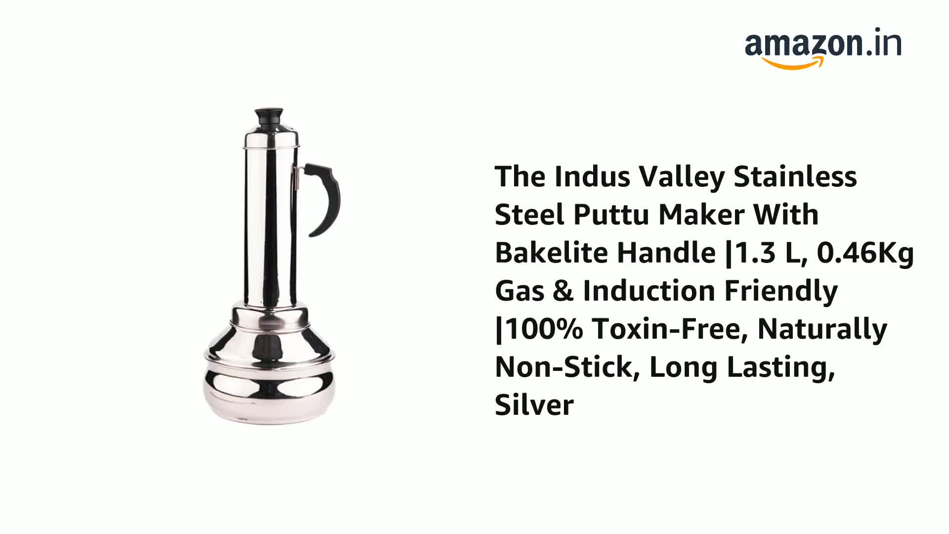 The Indus Valley Stainless Steel Puttu Maker With Bakelite Handle |1.3 L 0.46Kg Gas & Induction Friendly |100% Toxin-Free Naturally Non-Stick Long Lasting Silver