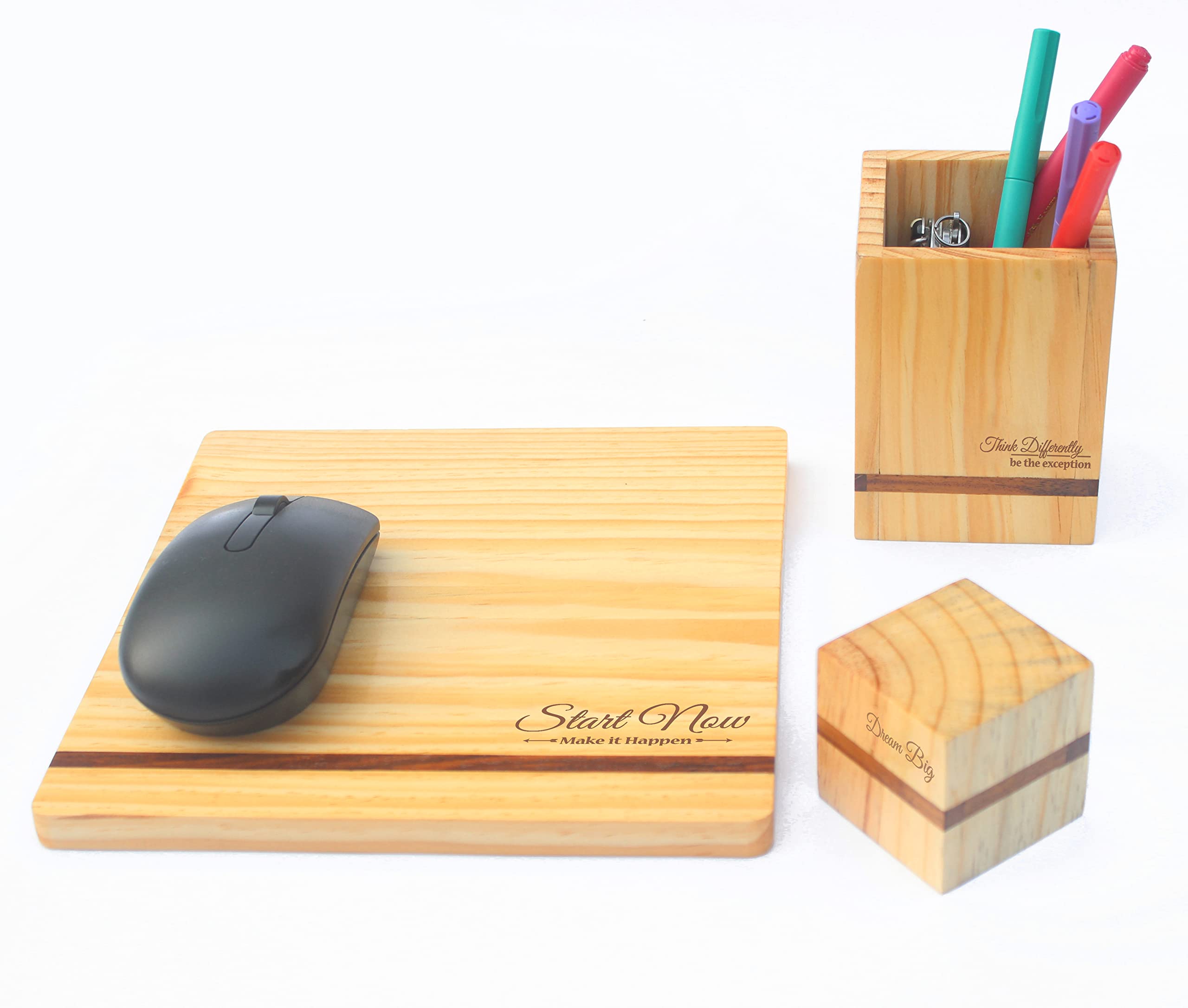 HomeOfficePen-StandIVEI Pine Wood PenstandMouse Pad Paper weight Combo - Customised work from home gift set/customized Desk Organiser - with name or logo engraving