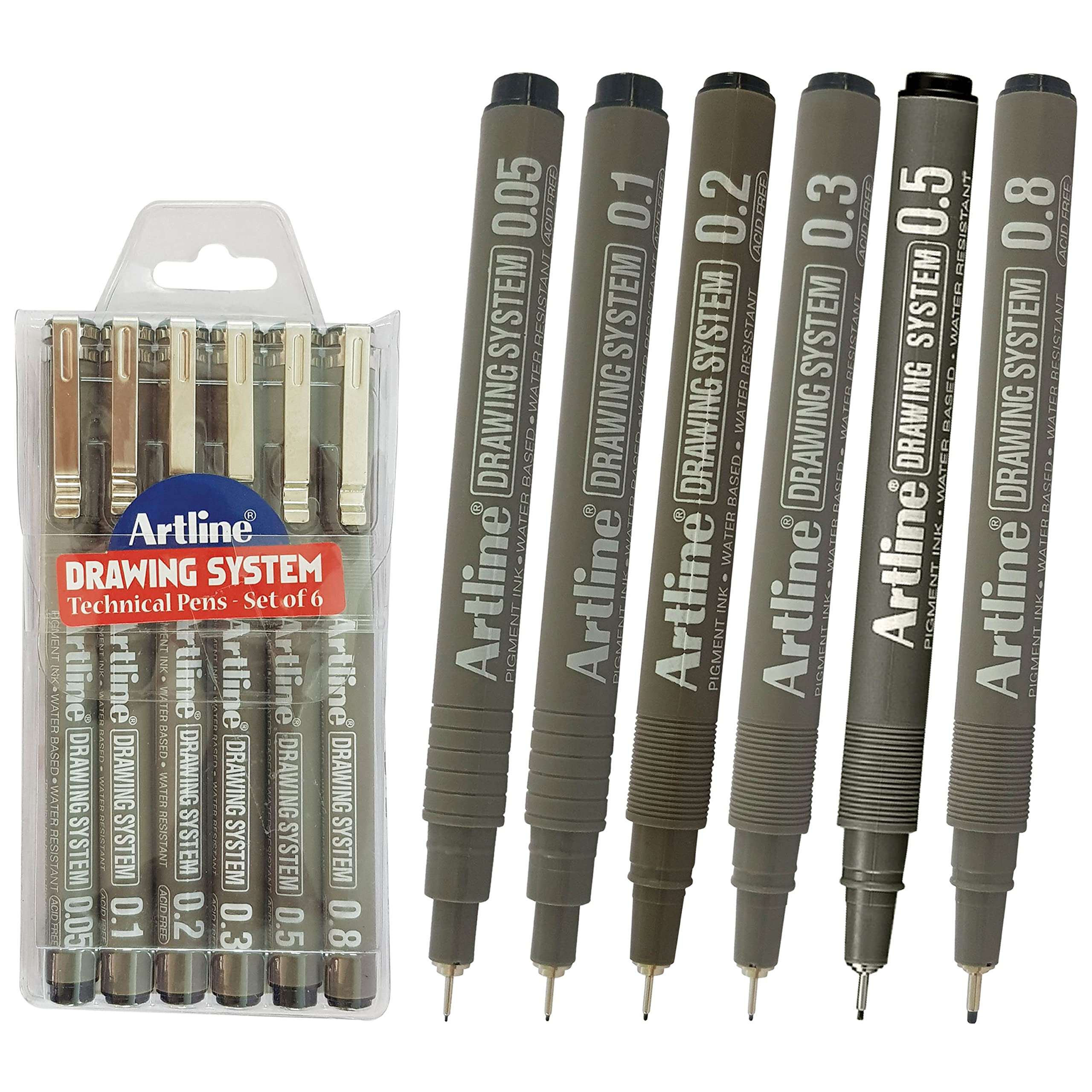 Artline Drawing System Technical Pens (BLACK) 6-Piece Wallet Set - 0.05 0.1 0.2 0.3 0.5 0.8mm Fine Tip Pens can be used for drafting illustrating and graphic design. Friction-proof nib enables you to draw a consistent writing width. Metal reinforced collar nib is suitable for ruler and template work without causing any nib damage. Acid Free. Features: Polyacetal Resin Nib Highly Water Resistant Fade-proof Water Based Ink Pigment Ink Xylene Free Recommended Use: General Writing Cards Drawing Graphics/Design