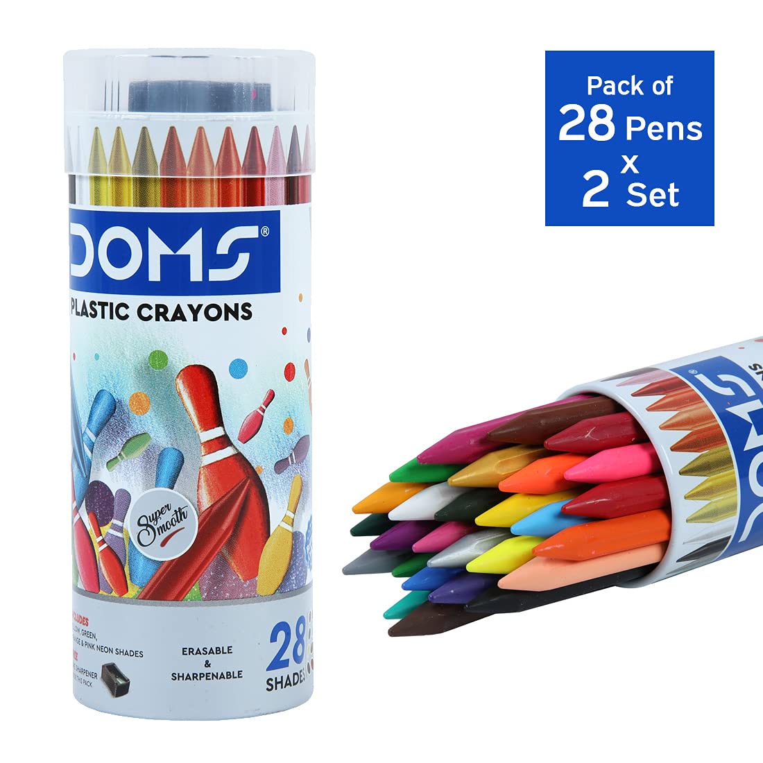 Doms 28 Shades Erasable Plastic Crayons Round Tin Box | Smooth & Even Shading | Bright & Playful Colors | Free Sharpner Inside | Non-Toxic & Safe For Childrens | Pack of 2
