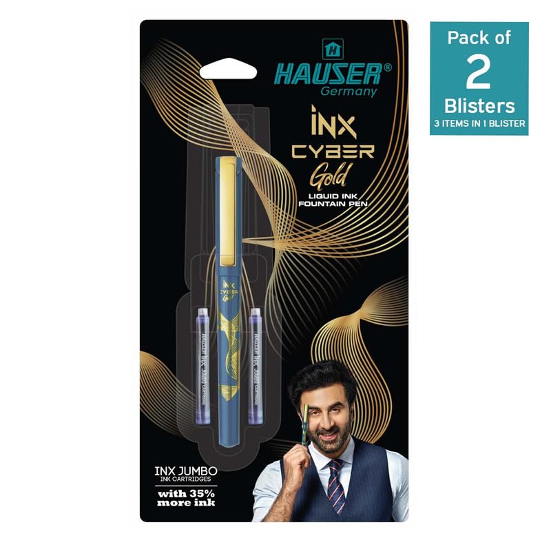 Hauser Inx Cyber Gold Fountain Pen | Smooth Round Nib With Iridium Tip | Unique Liquid Ink System | 2 Ink Cartridges | Blue Ink Pack Of 2 - Body Color May Vary