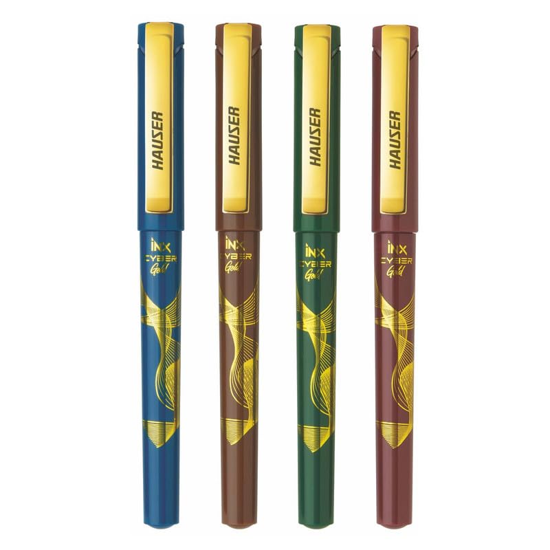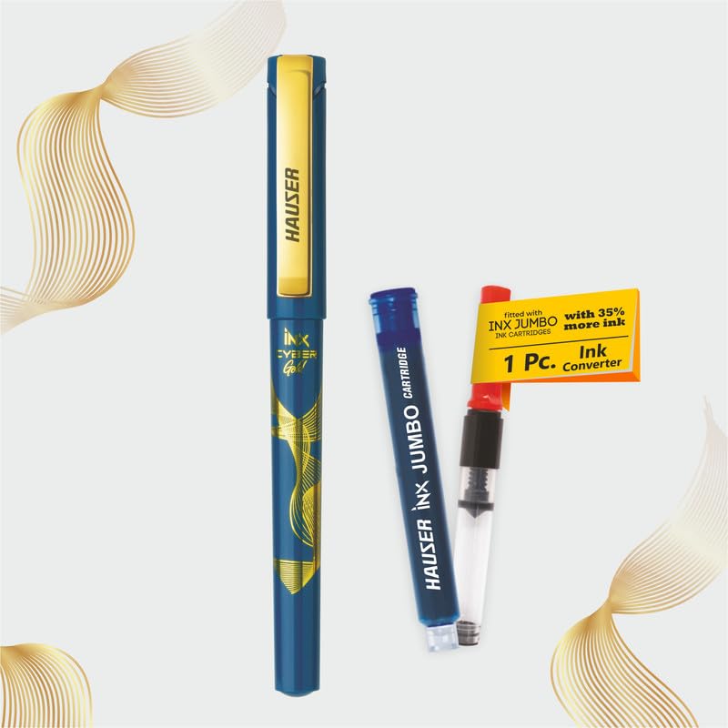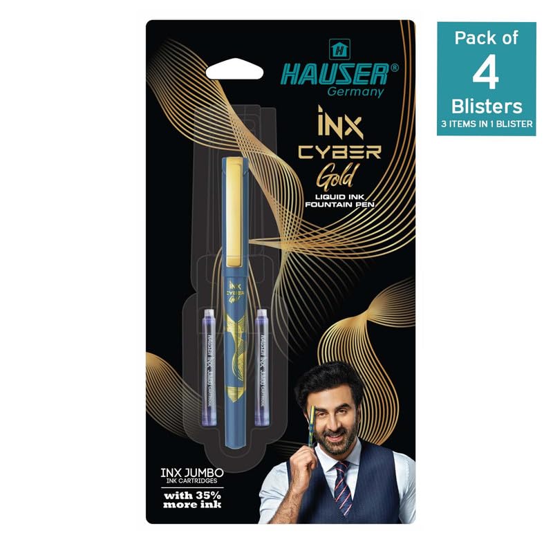 Hauser Inx Cyber Gold Fountain Pen | Smooth Round Nib With Iridium Tip | Unique Liquid Ink System | 2 Ink Cartridges | Blue Ink Pack Of 4 - Body Color May Vary