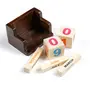 PACKAGE CONTENTS: A brown wooden holder with 5 wooden blocks; 2 with numbers for Dates & 3 for Months; DIMENSIONS: 2.5 in X 2 in X 1.75 in