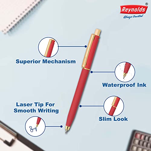 This high-quality Reynolds ball pen with comfort grip is lightweight that helps you in uninterrupted writing for long hours. The smudge-resistant ink in this ball point pen ensures clean writing and the laser tip technology gives you precision while writing. Suitable for all ages the ballpoint pen comes in sleek design and various colour options. For all our gel pens fountain pens and ball point pens high quality manufacturing standards are used to ensure you get a reliable writing tool in your hand. Reynolds is one of the most reputed brands in ball pens manufacturing cap-off ball pens retractable click ball pens roller ball pens gel pens fountain pens and other types of pens since 1945. We provide red ball pen black ball pen blue ball pen to help you get the best word on the paper.