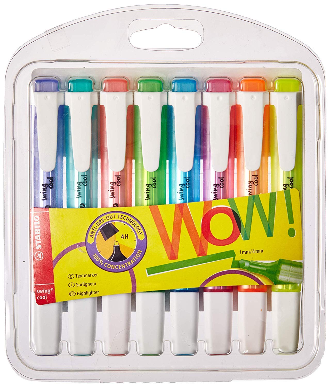 These fun fluorescent STABILO Swing Cool Highlighters feature anti-dry out technology with 4 hours cap off time for extended use. The handy pocket clip is ideal for use on the go and the non-slip matt finish grip zone provides convenience in use. These glossy striped pens have a variable line width of 1-4 mm for highlighting and underlining important passages. The highlighters feature a water based ink and ventilated cap for safety. This pack contains six assorted highlighters in orange yellow green turquoise blue and pink.