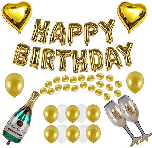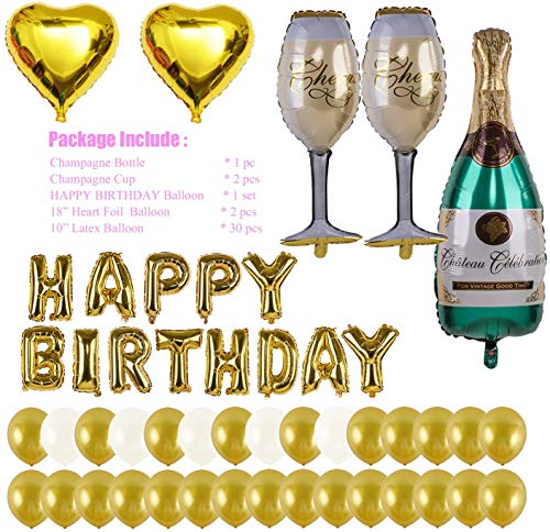 About This Gold Theme Brthday Party set This Happy Brthday Balloon Decoration Set comes with 2pcs 18 hert style foil balloon 1 set of happy Brthday foil balloon dozens of 12 gold balloons and gold confetti latex balloon 1pc bottle + 2pcs cups...Whether it is a first Brthday party decorations or 21st 30th 40th 60th 70th Brthday party. You can use this beautiful set to decorate. Make someone special day an unforgettable experience! Our gold party decorations will transform your venue or home make it looks magical. excellent choice for you Brthday party supplies Whole set will offer you a gentle and fragrant Brthday party memory. What it have inside package Huge Gold Foil Balloon * 2 pcs Gold HAPPY BrthDAY foil balloon * 1 set Champagne Bottle + Cup ( 1+2 ) * 1 set 10 Latex Balloon * 30 pcs Application Brthday Party Decoration