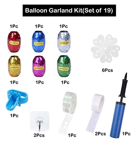 WHAT YOU WILL RECEIVE: 6pcs curling ribbon 6pcs flower clip 1pc balloon pump 1pc balloon tying tool 2pcs hook 1pc glue dot 1pc balloon arc roll. DIY MAKE FUN: These balloon garland strip balloon decorating strip balloon clips glue dots hand held inflator curling ribbon iridescent ribbon are applicable for 5 inch balloons 9 inch balloons 36 inch balloons latex balloons 12 inch 6 inch balloons 18 inch balloons and matte balloons pearl balloons mylar balloons helium balloons chrome balloons/ metallic balloons making balloon arch balloon garland tabletop balloon column balloon streamers balloon display balloon design. PREPARE YOUR PARTY IN AN EFFECTIVE WAY: These balloon garland kit includes all the balloon tying tool balloon tool you will need as party accessories making balloon knot DIY balloon garland DIY balloon arch quickly and easily. Balloons flower clips can build balloon flower; Glue dots help to stick balloons to walls or windows and also fill the gap; Use balloon ribbon to hang the balloon strip to make a colourful party. APPLICATIONS: These balloon garland kit balloon arch kit set balloon decorating strip kit are great party decorations party supplies for party Brthday wedding engagement proposal Small shower graduation holidays and any events. With these balloon strip balloon flower clips balloon pump iridescent ribbon knot tools and fishing line just takes you 60 minutes to prepare a wonderful party at home or outdoors. ATTENTION & WARNING: Balloons in these pictures are NOT included in these balloon garland kit balloon arch kit. Package only includes party accessories of balloon strip dot glue hand held infiltrator and curling ribbon while balloons are only for your reference. These balloon decorating strip kit contain small parts that may cause suffocation if swallowed. Please keep them away from b.