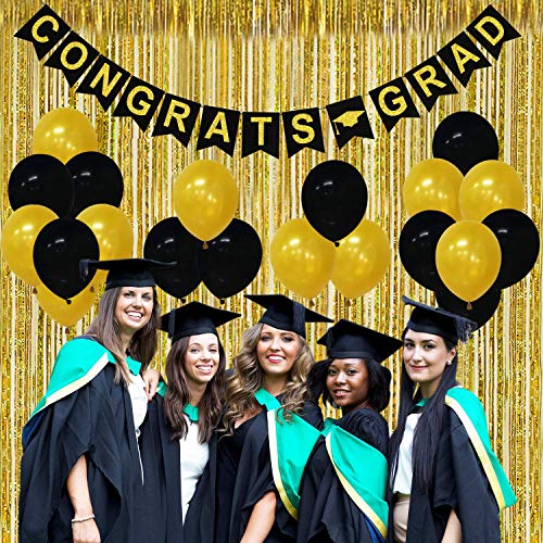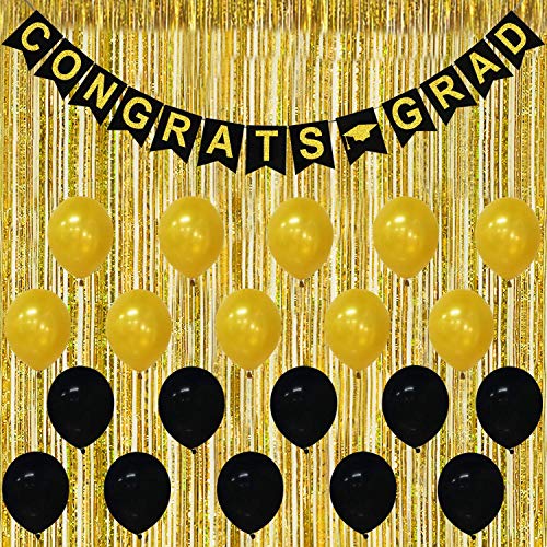 • What You Will Get: 1 Congrats Grad banner 2 set Foil Fringe Curtain 15 Black Latex Balloons 15 Gold Latex Balloons