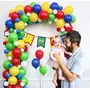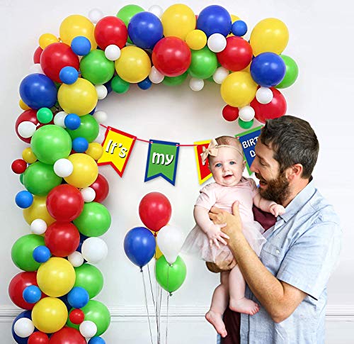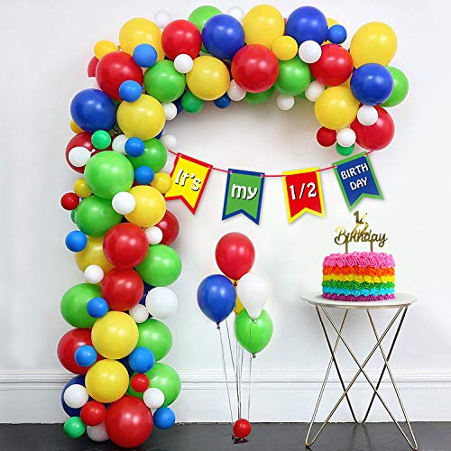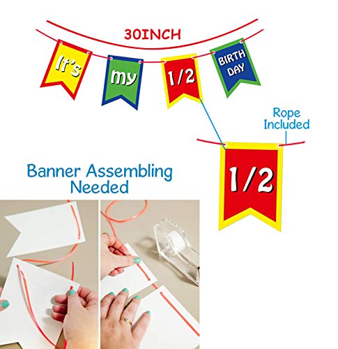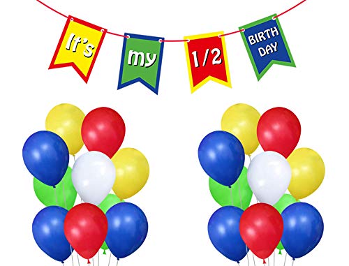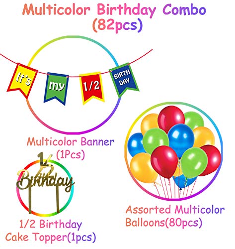 Package include 1pc multi colour it's my 1/2 Brthday banner 80pcs multi colour balloons and 1pc half Brthday cake topper. The banner is made with high quality card stock paper is need to be assemble. The length of the banner is 30inch long. The multi colour latex balloons are all helium or air supported. Each of the balloons size is 12inch approx. The cake topper is 6 Inches in length and 5.7 inch width each topper is cut from thick acrylic. you can use the half year Brthday set as party table backdrop or table centerpiece or decorating the wall decorating according to your need and your preference.