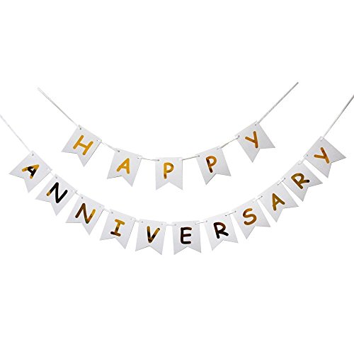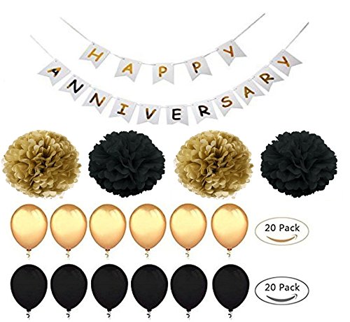Anniversary Pack Includes - Happy Anniversary Banner with Gold Black Balloon & 2 Golden Pom Pom & 2 black pom pom - 14 Inch Each