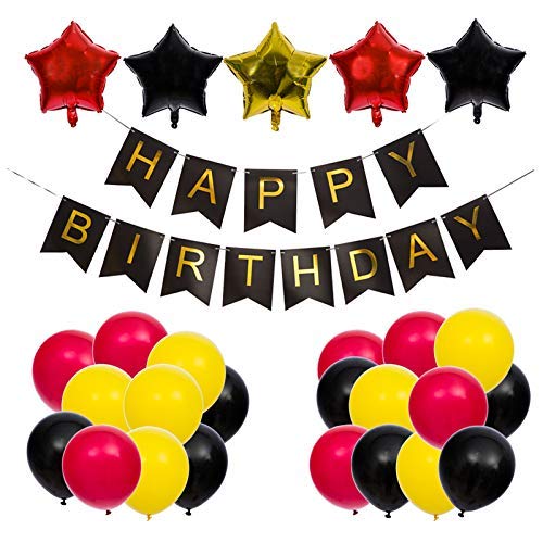 Package include Happy Brthday Banner Red Black Yellow balloons - 51 total latex balloons and Six star - 18 Inch each