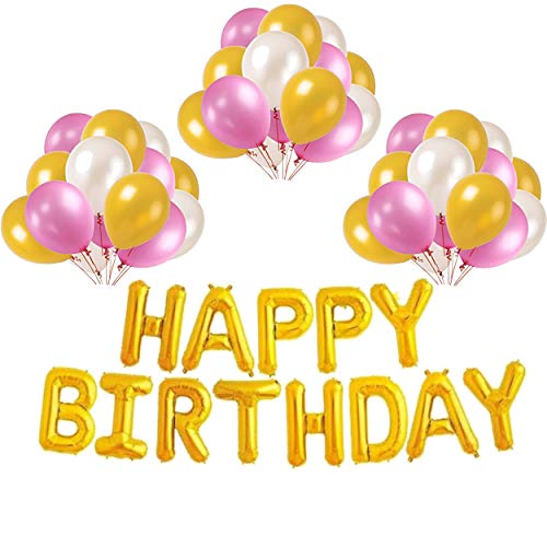 Masti Zone Happy Birthday Foil Letters Balloon Banner with 60 Pink White Golden Latex Balloon for Birthday Party