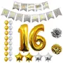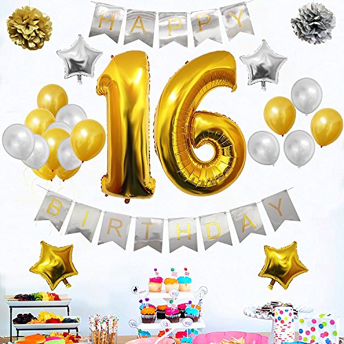 Color:16 Year BrthdayAll that you need to decorate and prepare for a 16 year old's Brthday party. Gold and silver kit of balloons banner pompom and much more.