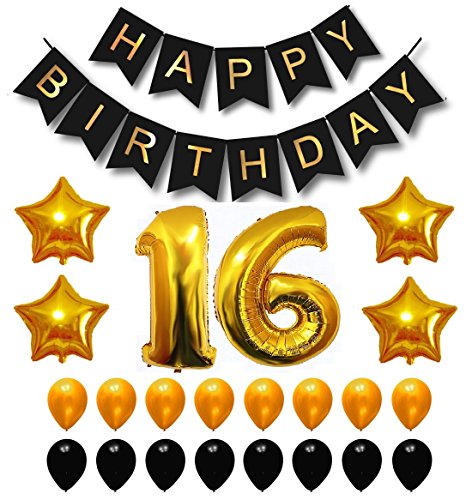 Happy Brthday Party Balloons Supplies & Decorations Set Black & Gold (16th Year)