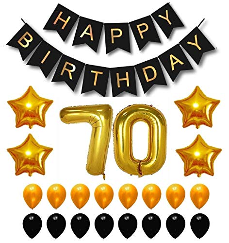 Happy Brthday Party Balloons Supplies & Decorations Set(Gold Number Foil Balloon+50 Gold & Black Latex Balloon+1 Black Happy Brthday Banner+ Four Gold Star Foil Balloons)- 70th Year