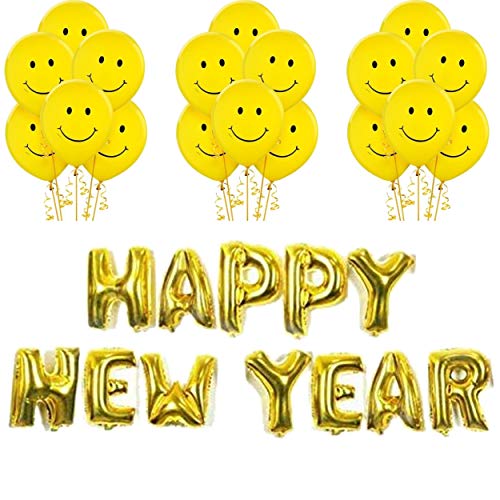 Happy New Year Foil Letters Balloon Banner with 25 Smiley Latex Balloon New Year Eve Party Christmas