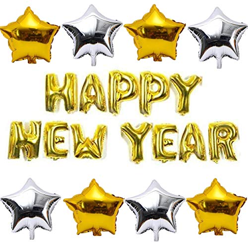 Happy New Year Foil Letters Balloon Banner with 6 Pcs Golden Silver Star Foil Balloons New Year Eve