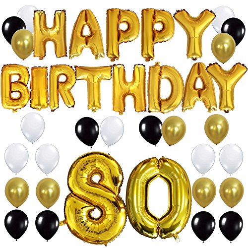 Theme My Party irthday Party Pack Black, White & Gold, Happy Birthday Letter Balloon and Number Balloonsfor Milestone Birthday (80)