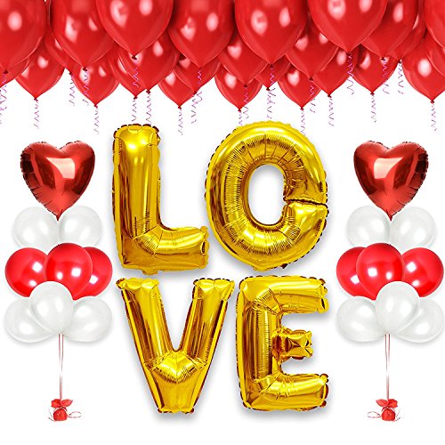 Surprise Your Loved One With Perfect Decoration - Package Include 16 Inch LOVE Foil Letter Balloon with 50 RED & WHITE Balloons Latex & two Foil Balloon hert Shape