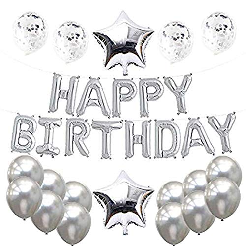 Color:SilverHappy Brthday Combo includes : 13 pcs Happy Brthday Banner + 1 Champagne Big Mylar Foil+ 30 Pcs Metallic balloons + Ribbon (Straw included to blow Foil Balloons )