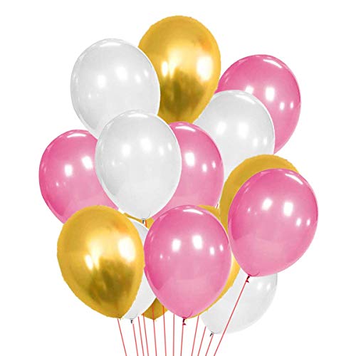 Gold White Pink Balloons Pack of 30 Package contain: 10 HD Metallic Balloons in Gold Colour10 HD Metallic Balloons in White Colour 10 HD Metallic Balloons in Pink Colour Size of each Balloon is approx 10 inches.From small KDs to grandparents everyone loves these colorful fun decorations. NON-TOXIC & SAFE:100% Natural Balloons Have Been Rigorously Tested High Quality Biodegradable Latex That is Safe to be Used around b or Toddler With Very Little To No Smells & Will not deflate overnight. TIPS & USED FOR :Strong Durable Brthday Party Favors1st Brthday of your Kid18th Brthday21ST Brthday30th Brthday 50th Brthday of your Parents or 75th Brthday of your Grandparents.