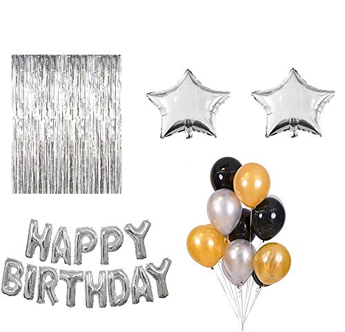 Happy Brthday Letter Foil Balloon Set of Gold + 3Pcs Silver Fringe Curtain (3 X 6 FeHappy Brthday alphabet letter foil balloon (Silver) set of 13 letters + Pack of 30 pcs Black Gold & Silver balloons Ship Non inflated Height of each letter is approx 16 inches and can cover wall space of about 20 sq. Feet Other balloons in picture only for reference .Complete backdrop for Brthday Suitable for Brthday theme party decorations and Brthday party supplies
