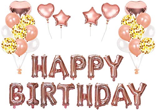 What You will get1 pcs 16-inch "Happy Brthday" balloon banner 10 pcs 9-inch rose gold and white latex balloons 6 pcs 12-inch pink confetti balloons 2 pcs 18-inch hert foil balloons 2 pcs 18-inch Star foil balloons