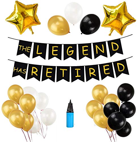 THE LEGEND HAS RETIRED Party Decorative Banner Decorations Kit Features: Material: Made of premium quality glorious gold printed letters very beautiful and not easily broken. Size: Every Latex Balloon 10 Inch Easy Operation: THE LEGEND HAS RETIRED Banner just need to cross the string latex balloons will come flat and we also shipped one air pump for you you could blow them up with it worry free. Ideal for retirement party or aged people party events. Style: Glorious style Package List: 1x THE LEGEND HAS RETIRED Banner 2x 18 Inch Gold Star Foil Ballons 10x Gold Latex Balloons 10x Black Latex Balloons 10x White Latex Balloons 1x Hand Air Pump