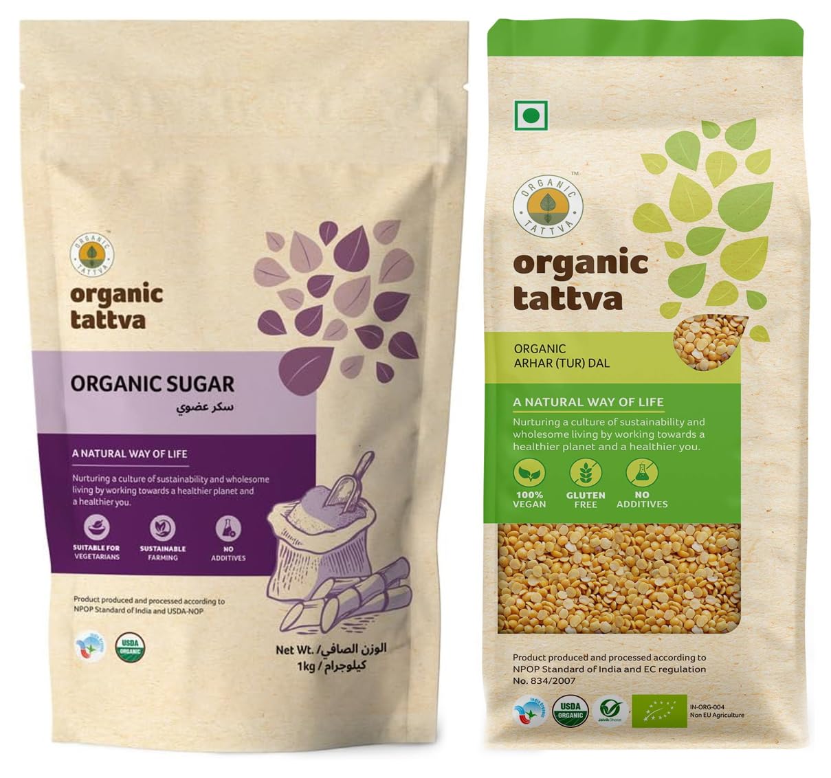 Organic Tattva Toor Dal, 1kg & Organic Tattva All Natural 'Sugar', Zero Chemicals, Organically Processed, from Freshly Squeezed Sugar Cane Juice (1 Kg, Pouch)