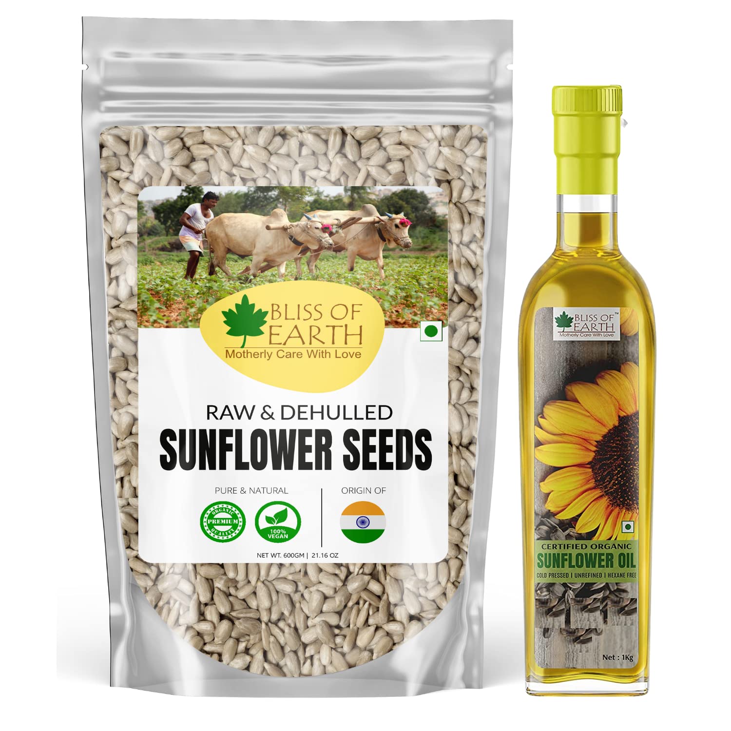 HomeProducts without categoryBliss of Earth Combo Of Dehulled Sunflower Seeds (600gm) For Eating & Weight Loss And Organic Sunflower Oil (1 Ltr.) for Cooking, Cold Pressed, Hexane Free (Pack Of 2)