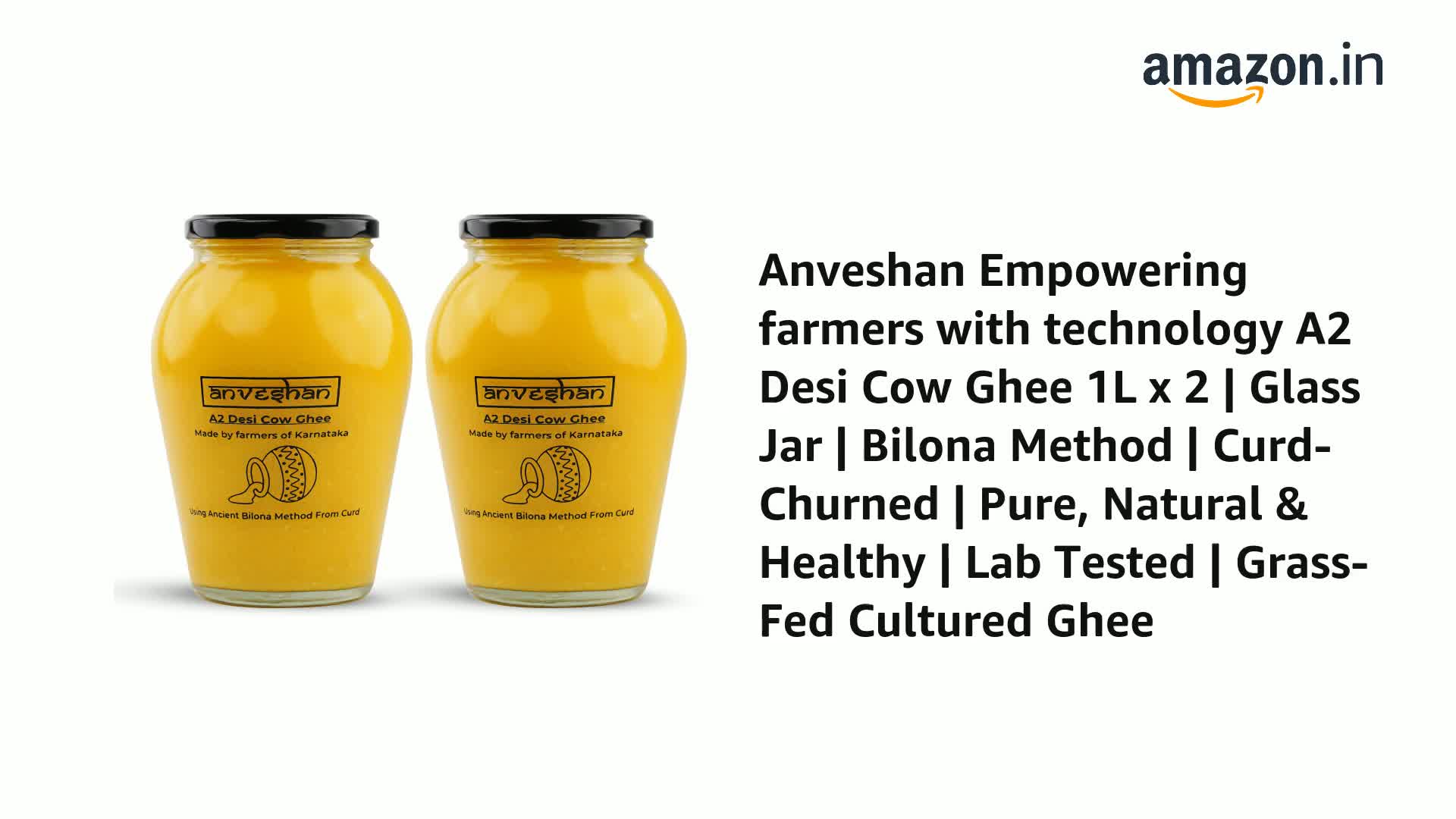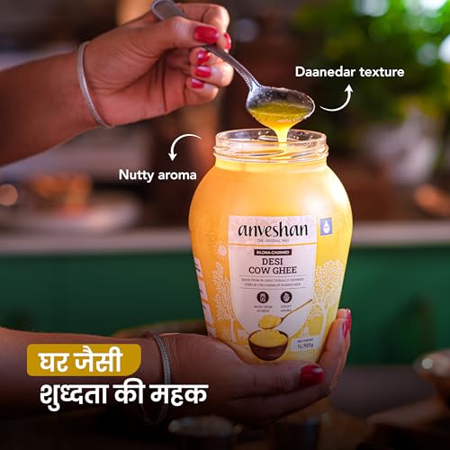 Anveshan A2 Desi Cow Ghee (1 Litre x 2 Jars) | Traditionally Bilona-Churned, Danedar Ghee | Aromatic| NABL Lab Tested (70+ tests), Cruelty-Free | Grass-Fed | Glass Jar