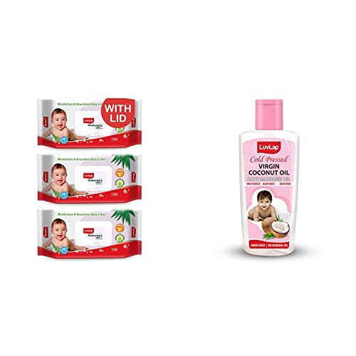 LuvLap Paraben Free wipes for baby skin with Aloe Vera Fragrance Free pH Balanced Dermatologically Safe Baby Wipes Rich in Vitamin E & chamomile extract 72 Wipes / Pack With Lid Pack 3 packsLuvLap moisturizing baby wipes with aloe vera are the perfect wipes for your baby's delicate skin. Enriched with the goodness of aloe vera and chamomile they are completely free of alcohol and harmful parabens. The pack also comes with a lid seal to ensure the quality remains consistent over time. After all your baby's safety is our prime concern.LuvLap Baby Hair & Skin Oil 100% Natural Cold Pressed Virgin Coconut Oil Baby Massage Oil Prevents Diaper Rash 200mlLuvLap Baby massage Oil is a specially crafted baby massage oil with many proven benefits for babies. It is unrefined unbleached and cold pressed. Its massage improves blood circulation nourishes muscles and bones. Regular massage with LuvLap Baby massage Oil also helps relieve colic improves baby's sleep pattern. It contains vitamin E which is good for healthy skin nourishes and strengthenes the hair and baby's scalp. Its a natural moisturizer for baby's skin keeping the skin soft and supple. It can also be used as a nappy rash cream and prevents any irritation from rashes. Good for cradle cap loosens the cradle cap flakes while nourishing the scalp.