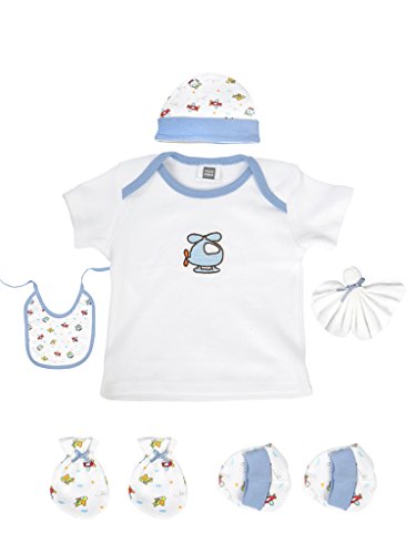 It contains one t-shirt one bibs one napkins one bonnet cap one pair of booties one pair of mittens