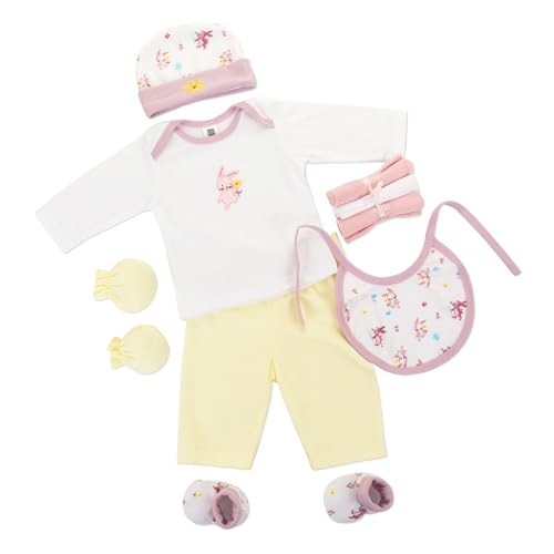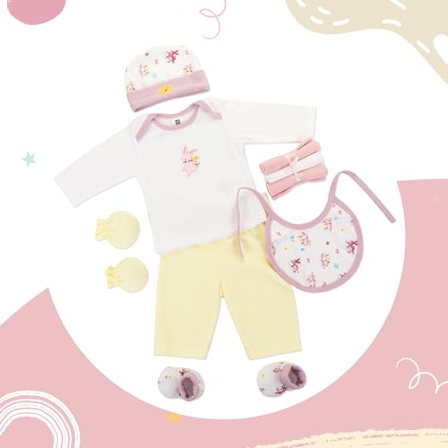 COTTON MATERIAL: Experience optimal comfort with baby clothing made from 100% breathable cotton ensuring your little one stays cool and cozy. STYLE STATEMENT: Elevate your baby's wardrobe with modern designs that make a stylish statement keeping them in vogue with the latest trends. CLOTHING ESSENTIALS FOR ALL-DAY WEAR: Discover clothing essentials designed for long all-day wear providing both comfort and durability for your baby's active moments. BEAUTIFUL RIBBON-WRAPPED GIFT BOX: Present your little one or loved ones with the cutest gifting option â our clothing comes beautifully packaged in a ribbon-wrapped gift box. PACK OF 10: T-shirts Pajamas Cap Napkins (3) Cloth Booty Mittens bibs