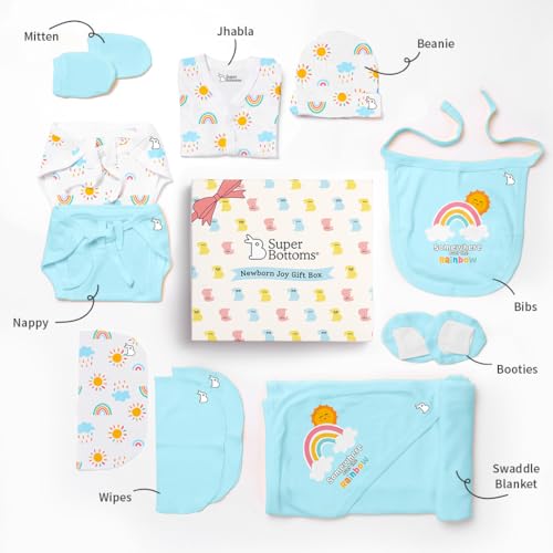 Wondering what to gift to a newborn baby? SuperBottoms brings you the perfect baby gift set for new born! It is ideal for babies from day 1 to 3 months. Contains thoughtfully handpicked 11 unisex items 3 Reusable Baby Wipes a Bib a pair of Mittens and Booties each a Beanie a Swaddle and a Jhabla. Indeed all the products are designed with the gentlest care and the greatest love by a team of moms. They are made with 100% Cotton totally safe for the newborns delicate skin. Ideal gift for newborn baby boy and girl or preparing for your own newborn's arrival because every baby deserves the best from day one! What it contains? Jhabla - 1 Wipes - 3 Bib - 1 Beanie - 1 Swaddle - 1 Mittens - 1 pair Booties - 1 pair Nappies - 2`