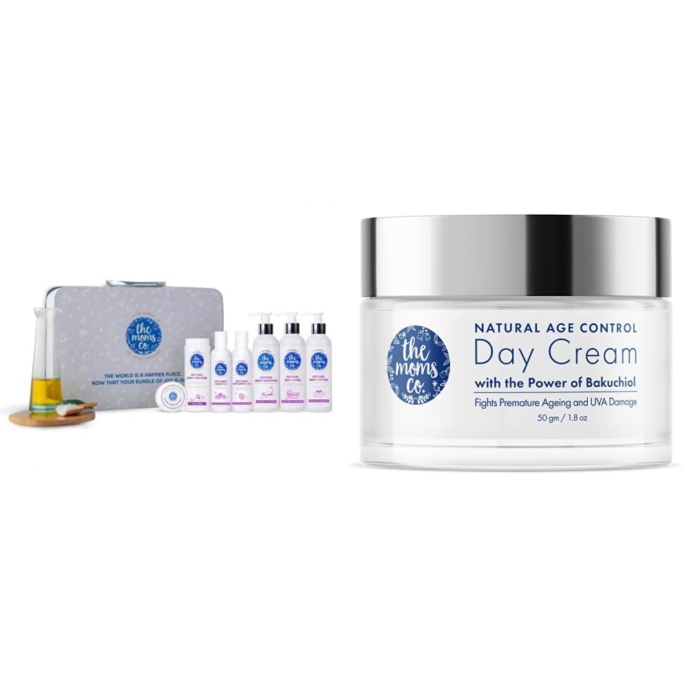 The Moms Co. Everything for Baby with Suitcase Gift Box and 7 Skin and Hair Care Baby Products | Baby Care from day 1 | Baby gift set for new born | Baby shower gift |New born baby giftOur everything for baby gift set is the baby's first suitcase packed with love and with everything needed to look after the baby's delicate skin and hair for those first few months. Gift set includes: natural baby wash (200ml) natural massage oil (100ml) natural baby lotion (200ml) natural hair oil (100ml) natural baby shampoo (200ml) natural diaper rash cream (25g) and natural baby powder (100g). The products come packed in our signature baby suitcase. We recommend using it as your memories box to store all those baby's firsts!The Moms Co Natural Age Control Day Cream l Face Cream l Reduce Fine Lines Wrinkles & Sun Protection l Anti Ageing with Natural Retinol & Green Tea (50 gm)He moms co. Natural age control day cream enriched with bakuchiol- a natural alternative to retinol green tea extract hyaluronic acid & sea buckthorn oil fights early signs of ageing and protects the skin from pollution and uv-a induced damage.