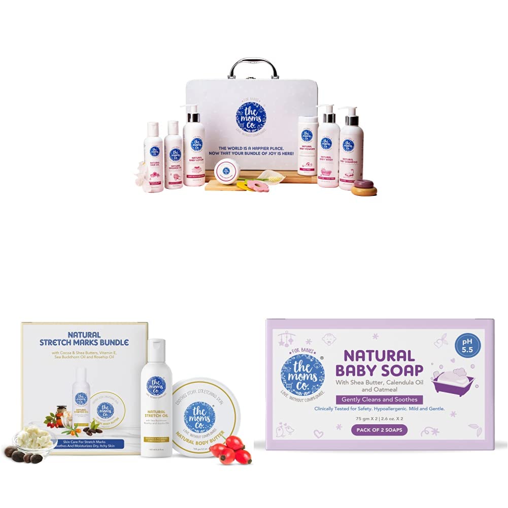 The Moms Co. Everything for Baby with Suitcase Gift Box and 7 Skin and Hair Care Baby Products | Baby Care from day 1 | Baby gift set for new born | Baby shower gift |New born baby giftOur everything for baby gift set is the baby's first suitcase packed with love and with everything needed to look after the baby's delicate skin and hair for those first few months. Gift set includes: natural baby wash (200ml) natural massage oil (100ml) natural baby lotion (200ml) natural hair oil (100ml) natural baby shampoo (200ml) natural diaper rash cream (25g) and natural baby powder (100g). The products come packed in our signature baby suitcase. We recommend using it as your memories box to store all those baby's firsts!The Moms Co All Natural Complete Care Solution for Stretch Marks for Women with 7 in 1 Natural Stretch Mark Oil (100ml) and Natural Body Butter (100g) | |Stretch Mark Oil | Stretch Mark Removal CreamThe moms co. Natural tummy butter for pregnancy (200g/ 7 fl. Oz.) and natural stretch marks oil (100ml/ 3.4 fl. Oz.) is our best combination to prevent stretch marks and for stretch marks removal. The moms co. Natural shea & cocoa butter stretch mark cream are an australia-certified txin free pregnancy body cream while natural stretch oil is a certified txin free belly oil for pregnancy. These are a combination of cocoa and shea butter with natural vitamin e buckthorn oil and vitamin c rich rosehip oils that increases your skin's natural elasticity providing comfort to your stretching belly hips and breasts. Protect your skin The natural way with the moms company luxurious pregnancy skin and prenatal massage products. This all-natural best pregnancy stretch mark cream bundle nurtures your entire body and relieves the itch of stretching skin as your belly breasts and hips grow with your baby. With cocoa and shea butter for pregnancy which is known to soften skin and prevent scarring. Great for use as a stretch mark removing cream even for stretch marks after delivery.The Moms Co. Natural Baby Soap (75gms)The Moms Co. Natural Baby Soap is a super gentle cleanser & a rich moisturizer all rolled into a bar. With a pH of 5.5 which is the same as the pH of a baby's skin this bar gently cleanses without disrupting the skin's pH balance. It is an expert blend of Oatmeal Extract that works effectively on all skin types including eczema prone skin; Shea & Kokum Butters & Calendula Oil. Gentle Coconut Based Cleansers clean your baby's skin without drying and the added moisturizers- Shea & Kokum Butters leave your baby's skin soft & nourished The added Oatmeal extract & calendula oil soothe even the driest skin of skin types including eczema prone skin.